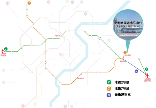 上海新國際博覽中心戰略性地坐落于浦東經濟開發區,距離上海新國際博覽中心600米處有一大型交通樞紐站,即龍陽路站(位于龍陽路上),包括多條路公交線路起點站、軌道交通2號線龍陽路站、軌道交通7號線龍陽路站以及磁懸浮列車終點站。從2號線龍陽路站步行到展館大約需10分鐘;從7號線花木路站步行到展館大約1分鐘。